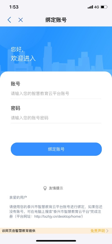 情況二:用戶有泰興市智慧教育云平臺賬號,且沒有綁定應用,進入賬號綁定頁面,可輸入云平臺賬號和密碼,點擊【綁定賬號】完成綁定; 情況三:用戶有泰興市智慧教育云平臺賬號而且已經綁定應用,點擊應用直接跳過賬號綁定頁面;
