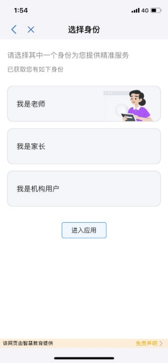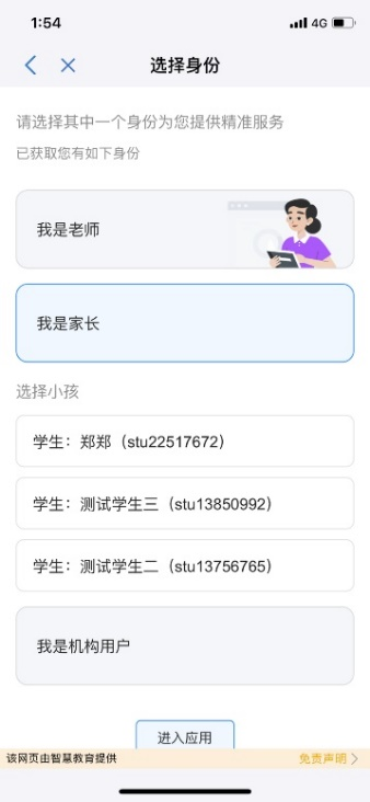 賬號綁定 選擇身份用戶登錄泰興一卡通APP,底部菜單點擊【生活服務】,在【校園教育】中點擊應用,成功綁定賬號后,進入選擇身份頁面,有以下兩種情況:情況一:用戶綁定的賬號有多重身份,成功綁定賬號后,進入選擇身份頁面,用戶可選擇其中一個身份,點擊【進入應用】;情況二:用戶綁定的賬號只有一重身份,成功綁定賬號后,跳過選擇身份頁面;