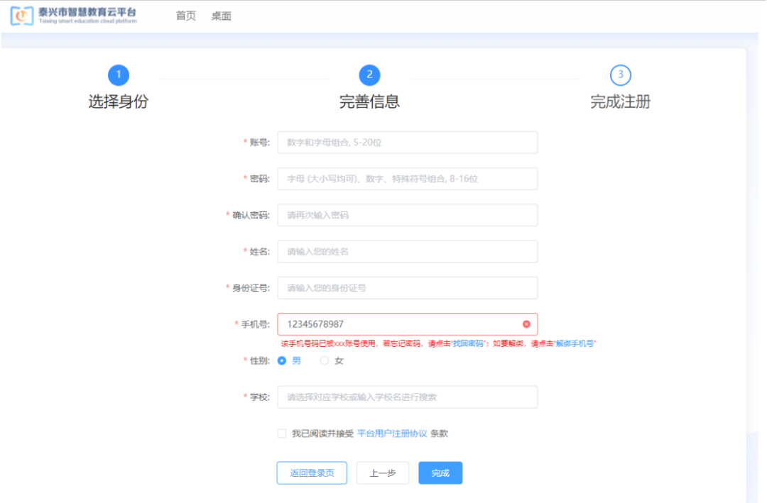 常見問題教師和家長在輸入手機號碼時,若手機號已被注冊過,有以下兩種情況:情況一:手機號被泰興云平臺注冊,則提示“ 該手機號碼已被xxx賬號使用,若忘記密碼,請點擊“找回密碼”;如要解綁,請點擊“解綁手機號””,找回密碼和解綁手機號是藍色字體跳轉鏈接;情況二:手機號被其他平臺注冊,則提示“該手機號碼已在其他學校平臺注冊,請前往https//pass.changyanm 使用手機號登錄查看學校平臺及賬號信息”;