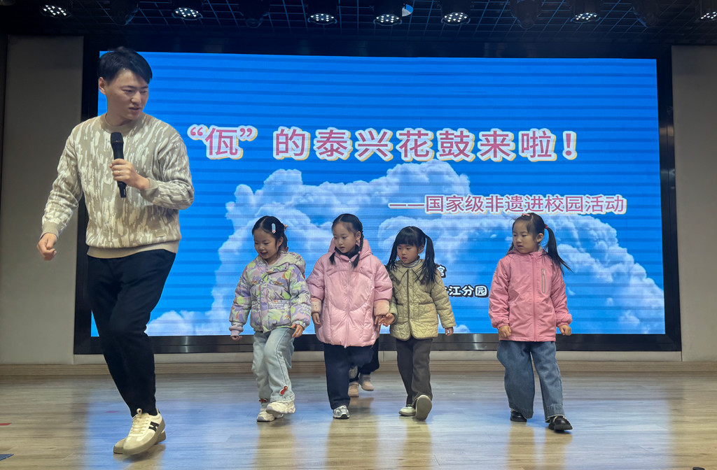 稚嫩的童聲應(yīng)和著悠揚的旋律,飄動的衣角隨著跳躍的身影翻飛……今日,泰興市育紅幼兒園文江分園內(nèi),孩子們化身“小小傳承人”,踏著歡快的節(jié)奏,學習國家級非物質(zhì)文化遺產(chǎn)——“泰興花鼓”。這場寓教于樂的“非遺啟蒙課”,讓傳統(tǒng)文化與童真童趣碰撞出絢爛火花。