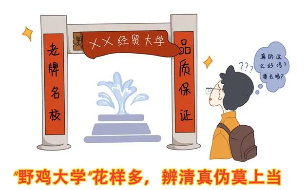“野雞大學(xué)”也稱“虛假大學(xué)”“學(xué)店”,其以謀利為目的,通常采用與知名大學(xué)院校容易混淆的名稱,以混淆視聽的方式招收學(xué)生,亂發(fā)文憑。這些學(xué)校都是不具招生資格、沒有辦學(xué)資質(zhì)、涉嫌偽造售賣虛假學(xué)歷文憑證書、涉嫌非法招生或網(wǎng)絡(luò)詐騙的虛假大學(xué)。稍有不慎就有可能誤入其中,尤其是對(duì)于考試成績(jī)不太理想的考生,更應(yīng)謹(jǐn)慎辨別。