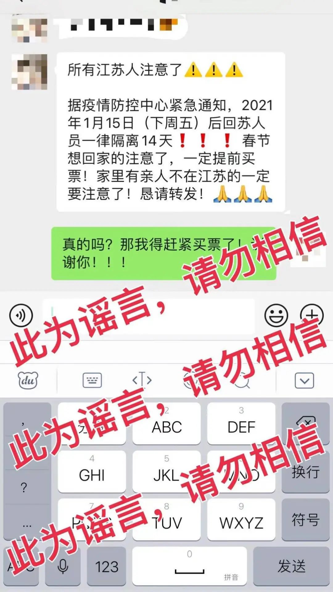 臨近春運(yùn),疫情防控形勢日益嚴(yán)峻,與返鄉(xiāng)回程相關(guān)的謠言開始出現(xiàn)。日前,就有一條關(guān)于來蘇返蘇人員入蘇隔離的信息在微信等社交媒體上傳播開來。