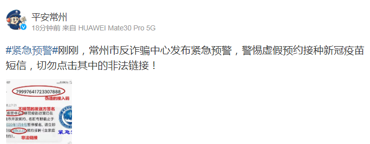 最近,新冠疫苗成了大家關注的熱點話題。 但也有一些不法分子借此發揮, 蹭“新冠疫苗”熱度進行詐騙。 剛剛,常州市反詐騙中心發布緊急預警, 警惕虛假預約接種新冠疫苗短信, 切勿點擊其中的非法鏈接!