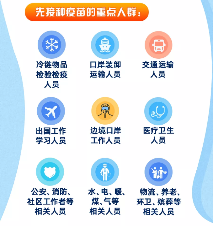 現在接種的對象有特定的人群,也就是重點對象。重點對象主要包括,第一個是接觸進口冷鏈食品的從業人員,包括生產、銷售、運輸以及流通的人群;第二個是出國、留學、培訓或者務工的人員;第三,海關、檢疫口岸的邊防人員;第四,醫務人員;第五,交通運輸的保障人員等等。