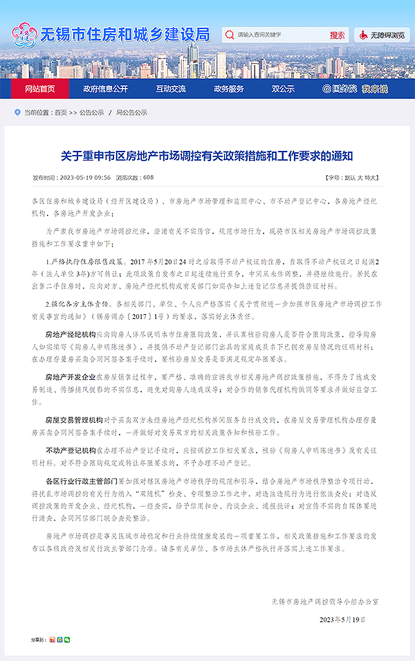5月19日,無錫市住建局官網(wǎng)發(fā)布《關(guān)于重申市區(qū)房地產(chǎn)市場(chǎng)調(diào)控有關(guān)政策措施和工作要求的通知》,澄清有關(guān)不實(shí)傳言,明確當(dāng)?shù)刈》肯奘壅呶醋髡{(diào)整,并將繼續(xù)施行,不滿兩年依舊不能過戶: