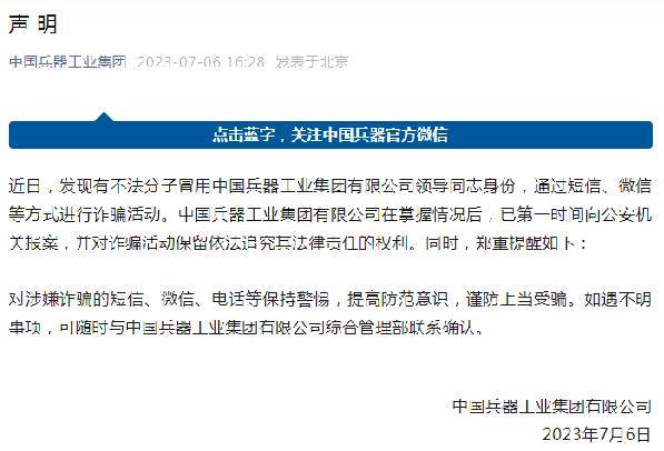 (圖片來(lái)源:“中國(guó)兵器工業(yè)集團(tuán)”微信公眾號(hào)截圖) 真相:中國(guó)兵器工業(yè)集團(tuán)有限公司發(fā)布聲明稱,近日,發(fā)現(xiàn)有不法分子冒用中國(guó)兵器工業(yè)集團(tuán)有限公司領(lǐng)導(dǎo)同志身份,通過短信、微信等方式進(jìn)行詐騙活動(dòng)。中國(guó)兵器工業(yè)集團(tuán)有限公司在掌握情況后,已第一時(shí)間向公安機(jī)關(guān)報(bào)案,并對(duì)詐騙活動(dòng)保留依法追究其法律責(zé)任的權(quán)利。鄭重提醒公眾接到涉嫌詐騙的短信、微信、電話要保持警惕,注意核實(shí)信息,避免上當(dāng)受騙。(來(lái)源:“中國(guó)兵器工業(yè)集團(tuán)”微信公眾號(hào))