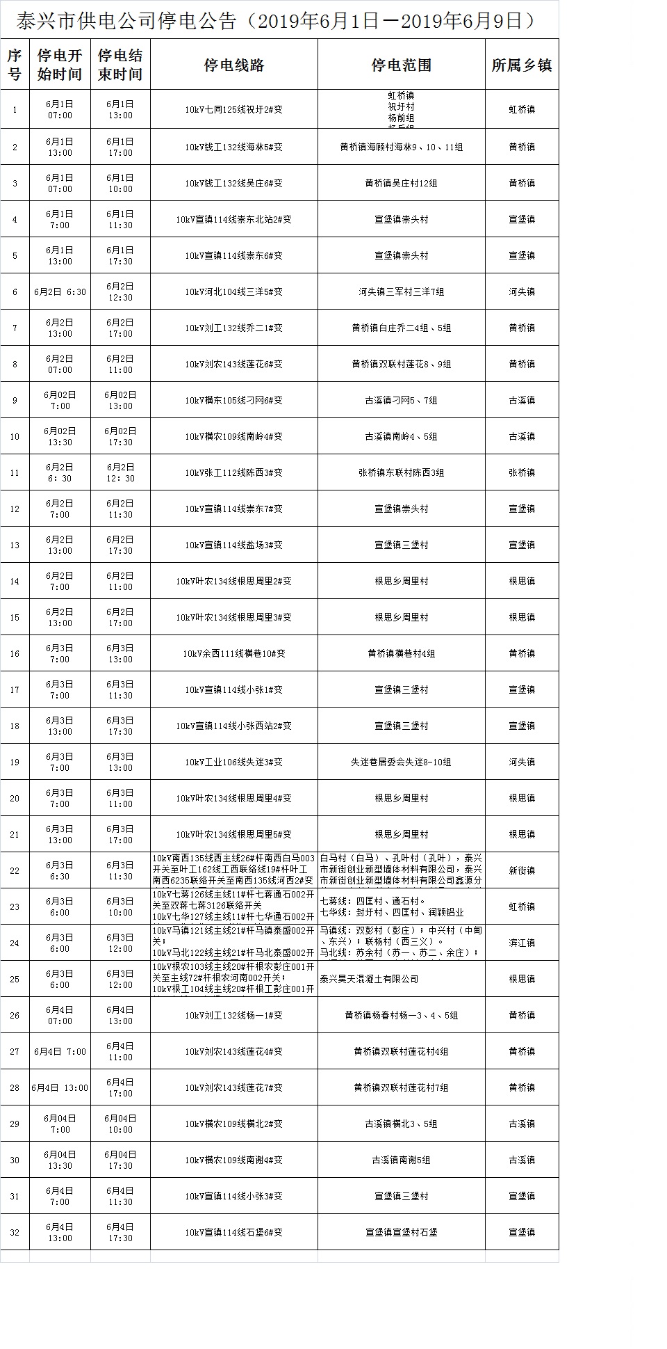 泰興市供電公司停電公告(2019年6月1日-2019年6月9日)
