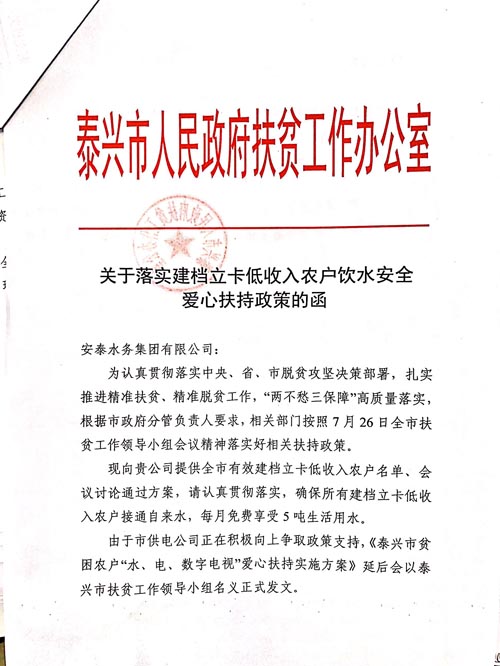 安泰水務(wù)集團(tuán)助力脫貧攻堅 積極推進(jìn)低收入農(nóng)戶免費(fèi)給水