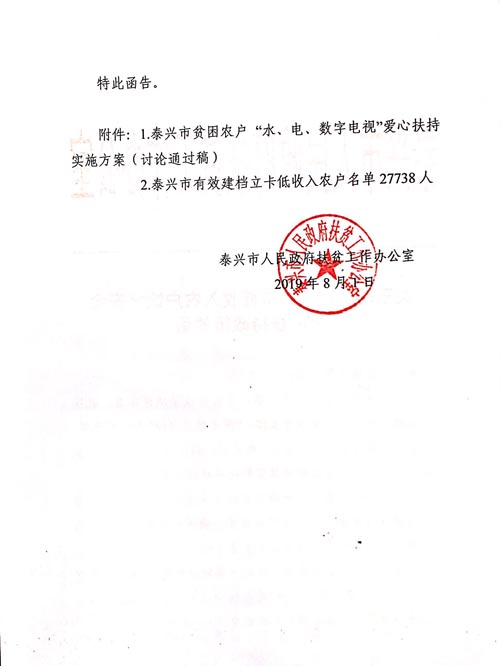 為促進(jìn)和諧泰興建設(shè),提高社會求助水平,根據(jù)2010年12月23日市政府第十七次常務(wù)會議紀(jì)要精神,市自來水公司按照市總工會和民政部門提供的花名冊,從2011年1月1日起,對全市困難居民(低保、特困戶)、城鄉(xiāng)重點(diǎn)撫恤對象每月每戶補(bǔ)貼2噸自來水(全年24噸,可在一年內(nèi)滾動使用),市財政對市自來水公司因“愛心供水”產(chǎn)生的費(fèi)用實行定額補(bǔ)助。2015年12月,根據(jù)物價﹝2015﹞62號《關(guān)于全市居民用水實行階梯價格制度的通知》,將補(bǔ)助標(biāo)準(zhǔn)提高至每月每戶補(bǔ)貼5噸自來水(全年60噸,2016年1月1日起實施)。截至2019年8月30日,愛心供水帳戶支出962.07萬元。