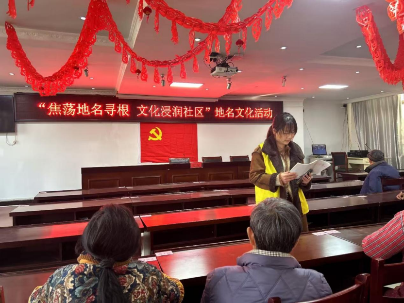 活動開始,張橋鎮(zhèn)民政服務站工作人員結合史料記載與民間傳說,深度解讀“焦蕩”地名的起源與演變---從移民拓荒的煙火傳奇到抗戰(zhàn)時期的紅色記憶,從地理特征的生動寫照到人文精神的代代傳承,同時串聯(lián)周邊關聯(lián)地名,勾勒出完整的本土地理文化脈絡,讓村民們深刻理解地名并非簡單代號,而是鐫刻歷史的活態(tài)密碼,更是承載民俗習慣與價值觀念的文化載體。