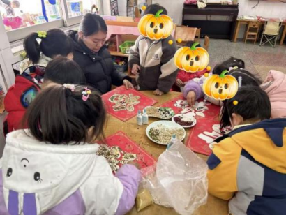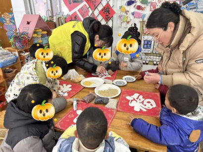 指尖生花,五谷粘福寄愿 “小朋友們,先在五谷顆粒上輕輕涂一點(diǎn)膠,再小心貼到福字上,注意不要把食材放進(jìn)嘴里哦!”在“五谷粘福”環(huán)節(jié),張橋鎮(zhèn)星火志愿隊(duì)志愿者為孩子們發(fā)放了福字底卡、五谷食材、膠棒和一次性餐墊,細(xì)致示范手工制作步驟,并反復(fù)強(qiáng)調(diào)安全與衛(wèi)生要點(diǎn)。孩子們分組圍坐,在民政服務(wù)站工作人員和幼兒園老師的巡回指導(dǎo)下,充分發(fā)揮創(chuàng)意:有的用紅豆勾勒福字輪廓,有的用綠豆、小米搭配出別致圖案,動(dòng)手能力較弱的小朋友也在一對一幫扶下逐步完成作品。現(xiàn)場歡聲笑語不斷,孩子們專注地粘貼每一粒五谷,指尖翻飛間,一幅幅色彩斑斕、充滿童趣的五谷福字逐漸成型,既鍛煉了動(dòng)手能力,又寄托了對生活的美好期許。