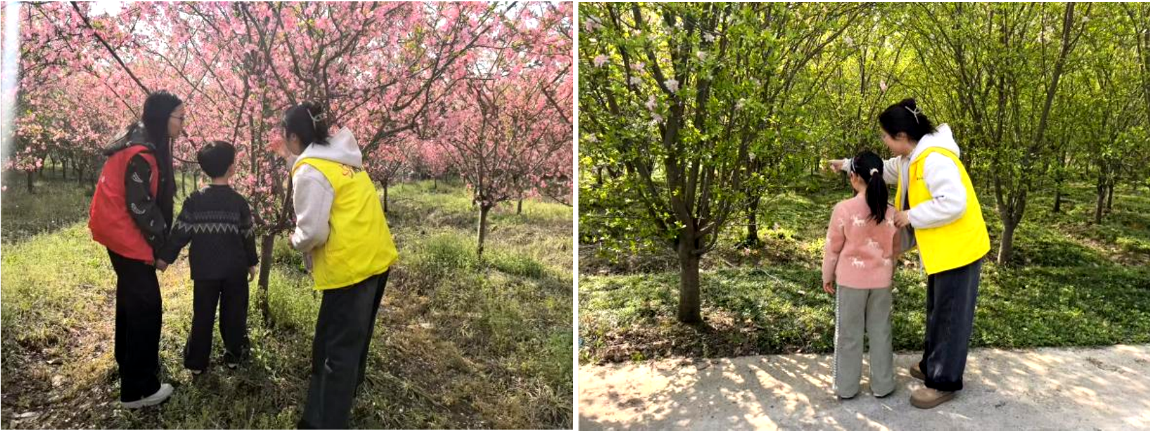 活動(dòng)當(dāng)天,陽光明媚,孩子們?cè)谏绻づc志愿者的全程陪伴下,滿懷期待地奔赴春日“課堂”。第一站便是海棠觀賞區(qū),滿園海棠競(jìng)相綻放,粉白相間的花朵綴滿枝頭,如云似霞,在春風(fēng)中輕輕搖曳。社工們結(jié)合春日自然場(chǎng)景,為孩子們生動(dòng)講解海棠的生長(zhǎng)習(xí)性與文化寓意,孩子們或駐足觀賞、或俯身輕嗅,用相機(jī)記錄下海棠花開的美好瞬間,童真的笑聲在花海中回蕩。